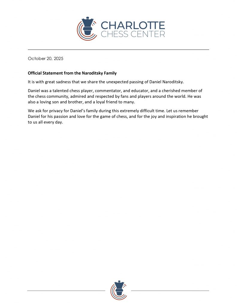 It is with profound sadness that the chess community learns of the unexpected passing of American Grandmaster Daniel Naroditsky (born November 9, 1995 – died October 19/20, 2025). His family announced the news through the Charlotte Chess Center in North Carolina, describing his death as sudden.